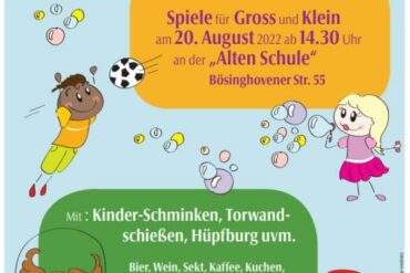 Am 20.08.2022 findet ab 14:30 auf dem Dorfplatz an der alten Schule (Bösinghovener Straße 55) in Bösinghoven wieder das Dorffest...