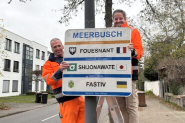 Wer auf einer der 14 Hauptzufahrtsstraßen die Meerbuscher Stadtgrenze passiert, sieht es nun auch Schwarz auf Weiß: Nach Fouesnant in...