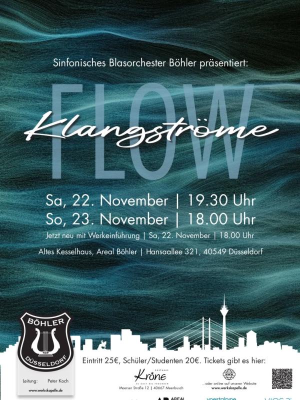 Unter dem Titel „FLOW“ präsentiert das Sinfonische Blasorchester am 22. und 23. November ihr neues Konzertprogramm vor der beeindruckenden Kulisse des Alten Kesselhauses auf dem Areal Böhler. Die rund 70 Musikerinnen und Musiker und der Leitung von Peter Koch präsentieren in diesem Jahr eine Musikauswahl aus mitreißenden sinfonischen Kompositionen und überraschender Orchestermusik, die für jeden Zuhörer etwas bereit hält.