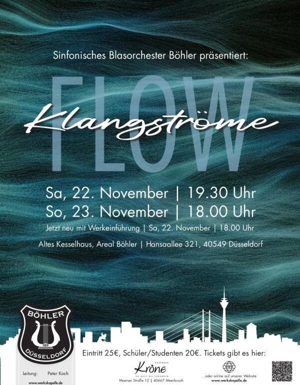 Unter dem Titel „FLOW“ präsentiert das Sinfonische Blasorchester am 22. und 23. November ihr neues Konzertprogramm vor der beeindruckenden Kulisse des Alten Kesselhauses auf dem Areal Böhler. Die rund 70 Musikerinnen und Musiker und der Leitung von Peter Koch präsentieren in diesem Jahr eine Musikauswahl aus mitreißenden sinfonischen Kompositionen und überraschender Orchestermusik, die für jeden Zuhörer etwas bereit hält.