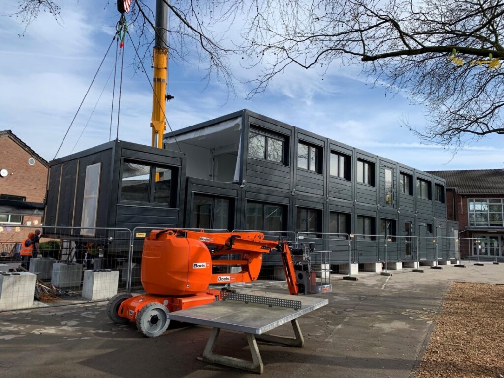 Im Zuge der Aus- und Umbauarbeiten zur umfassenden Neugestaltung der Theodor-Fliedner-Grundschule in Lank-Latum sind jetzt die Containermodule für einen zweigeschossigen Leichtbautrakt auf dem Schulhof eingetroffen. Das Provisorium wird bis zum Abschluss aller Bauarbeiten die Schulmensa, die Küche, den Toilettentrakt und Räume für die Offene Ganztagsbetreuung aufnehmen, die jetzt noch beengt im Altbauflügel der ehemaligen Aula untergebracht sind. Zugleich dient die Interimslösung in den kommenden rund zweieinhalb Jahren zum Schutz der Kinder als „Puffer“ zwischen der Baustelle und dem Schulhof. Unterricht findet im Interimsbau nicht statt.