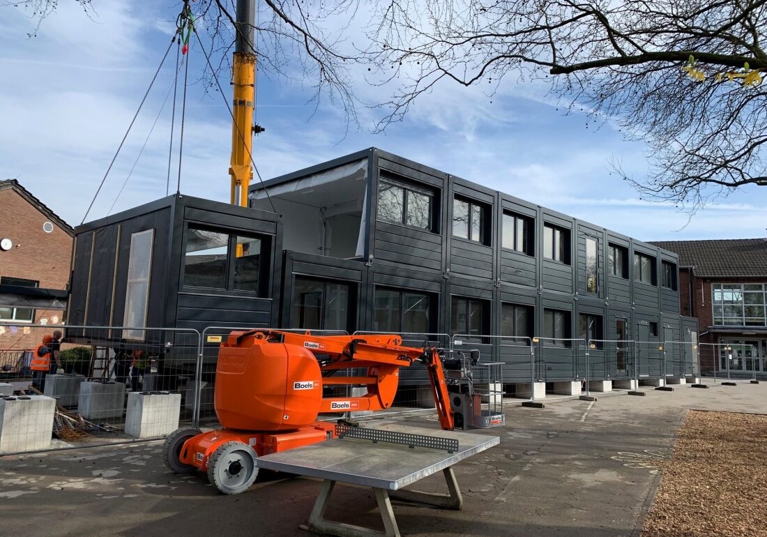 Im Zuge der Aus- und Umbauarbeiten zur umfassenden Neugestaltung der Theodor-Fliedner-Grundschule in Lank-Latum sind jetzt die Containermodule für einen zweigeschossigen Leichtbautrakt auf dem Schulhof eingetroffen. Das Provisorium wird bis zum Abschluss aller Bauarbeiten die Schulmensa, die Küche, den Toilettentrakt und Räume für die Offene Ganztagsbetreuung aufnehmen, die jetzt noch beengt im Altbauflügel der ehemaligen Aula untergebracht sind. Zugleich dient die Interimslösung in den kommenden rund zweieinhalb Jahren zum Schutz der Kinder als „Puffer“ zwischen der Baustelle und dem Schulhof. Unterricht findet im Interimsbau nicht statt.