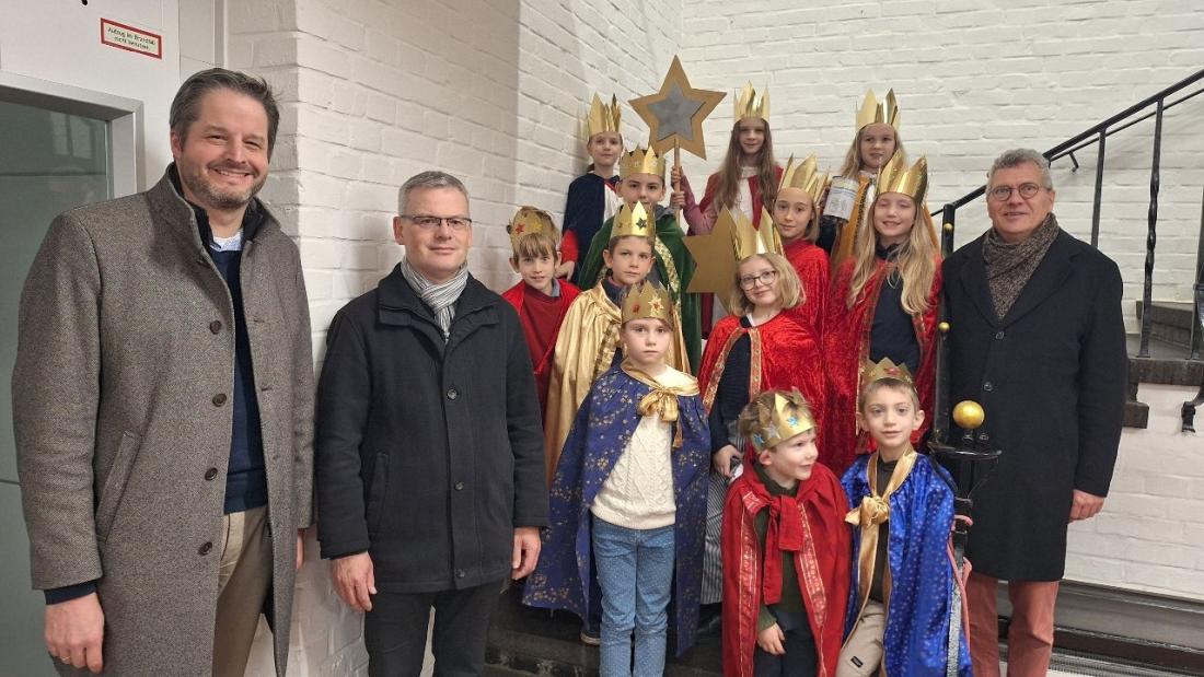 Traditionsgemäß stellten die Jungen und Mädchen in ihren bunten Königsgewändern dem Bürgermeister und den Pfarrern Michael Berning (St. Mauritius und Heilig Geist) und Norbert Viertel (Hildegundis von Meer) vorab das aktuelle Motto des Dreikönigssingens vor. In diesem Jahr unterstützt die Aktion vor allem Hilfsorganisationen, die sich in Bangladesh dafür einsetzen, Jungen und Mädchen aus der Kinderarbeit zu befreien und ihnen den Schulbesuch zu ermöglichen. Nach der Vorstellung gab es wie immer den ersten Geldschein in die Sammelbüchsen und ein munteres Weckmannessen. Zum Schluss wurde die Tür des Rathauses wieder mit dem Segensspruch „C + M + B“ („Christus mansionem benedikat – Christus segne das Haus“) und der Jahreszahl verziert.