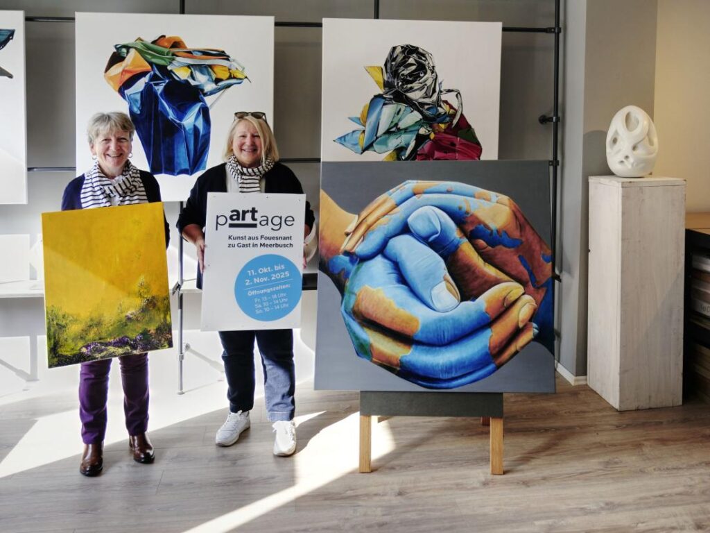 Dass nun auch Künstlerinnen und Künstler aus beiden Städten einander näher gekommen sind, ist der Galeristin Angelika Kraft und dem Fotokünstler Markus Hoffmann aus Osterath zu verdanken. 2024 besuchten die beiden Fouesnant, um Kontakte zu Gleichgesinnten zu knüpfen – mit Erfolg: Im Rahmen des jüngsten Delegationsbesuches aus der Partnerstadt durfte Bürgermeister Christian Bommers die erste Ausstellung von zwei Künstlerinnen aus Fouesnant in Meerbusch eröffnen. Bis einschließlich Sonntag, 2. November, sind in der Galerie Kraft an der Hochstraße 19 Arbeiten von Marie-Lise Le Campion zu sehen. Christine Ditière stellt parallel im Atelier von Markus Hoffmann an der Meerbuscher Straße 11 aus. Titel der Doppelausstellung: „pArtage“, was so viel heißt wie Teilen oder Teilhabe. „Unser gemeinsames Kunstprojekt macht deutlich, wie wichtig lang gelebte Freundschaften und Engagement über Grenzen hinweg für uns in Europa sind“, freut sich Angelika Kraft.