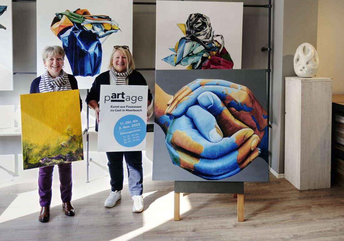 Dass nun auch Künstlerinnen und Künstler aus beiden Städten einander näher gekommen sind, ist der Galeristin Angelika Kraft und dem Fotokünstler Markus Hoffmann aus Osterath zu verdanken. 2024 besuchten die beiden Fouesnant, um Kontakte zu Gleichgesinnten zu knüpfen – mit Erfolg: Im Rahmen des jüngsten Delegationsbesuches aus der Partnerstadt durfte Bürgermeister Christian Bommers die erste Ausstellung von zwei Künstlerinnen aus Fouesnant in Meerbusch eröffnen. Bis einschließlich Sonntag, 2. November, sind in der Galerie Kraft an der Hochstraße 19 Arbeiten von Marie-Lise Le Campion zu sehen. Christine Ditière stellt parallel im Atelier von Markus Hoffmann an der Meerbuscher Straße 11 aus. Titel der Doppelausstellung: „pArtage“, was so viel heißt wie Teilen oder Teilhabe. „Unser gemeinsames Kunstprojekt macht deutlich, wie wichtig lang gelebte Freundschaften und Engagement über Grenzen hinweg für uns in Europa sind“, freut sich Angelika Kraft.