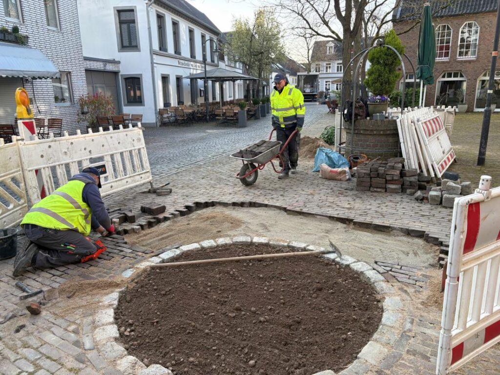 Die drei Bäume, die die St.-Sebastianus Schützenbruderschaft als Ausgleich für die gefällte Linde am Alten Schulhof gestiftet hat, wurden vom Fachbereich Grünflächen der Stadt ausgewählt und von einem heimischen Landschaftsgartenbaubetrieb eingesetzt. Eine Säulen-Hainbuche, eine Frühlingskirsche und eine Schmalkronige Gleditschie ergänzen nun das Grün im Ortskern. Großzügig ausgehobener Wurzelraum, der mit Pflanzgranulat aufgefüllt wurde, sorgt dafür, dass die Gleditschie auch unter dem Marktpflaster gut angehen und Wurzeln austreiben kann.