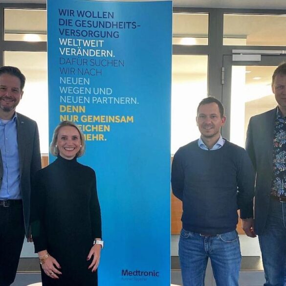 „Ein gutes Vertrauensverhältnis zu unseren Unternehmen ist ein zentraler Standortfaktor“. Christian Bommers mit Medtronic-Geschäftsführerin Dorothee Stamm, Wirtschaftsförderer Stephan Benninghoven und...